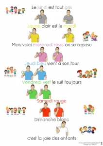 Ce support comprend également une comptine illustrée sur la semaine, idéale pour favoriser la mémorisation et l’apprentissage ludique.