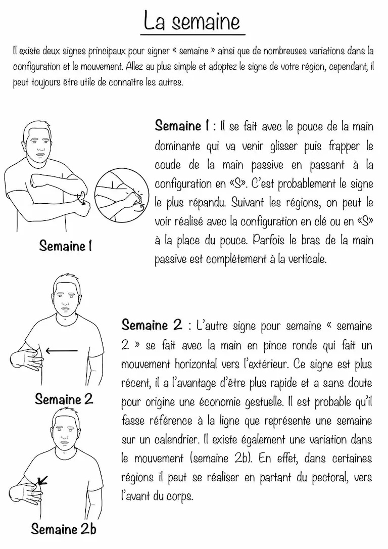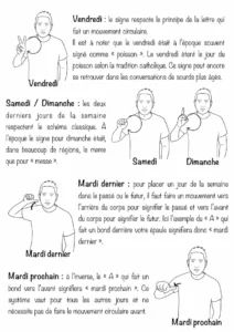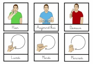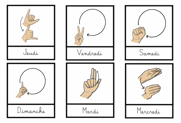 Description : Fiches illustrées avec explications des signes en LSF (Langue des Signes Française) sur le thème de la semaine. Ce support permet de découvrir, comprendre et mémoriser les signes des jours de la semaine.