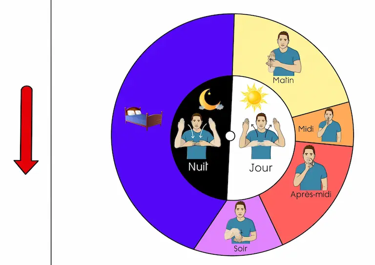 Liste des signes : lundi, mardi, mercredi, jeudi, vendredi, samedi, dimanche, week-end, mardi dernier, mardi prochain, matin, midi, après-midi, soir, nuit, jour.