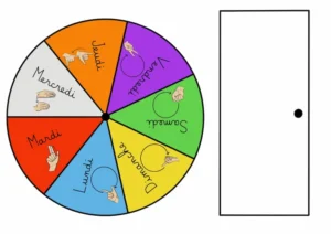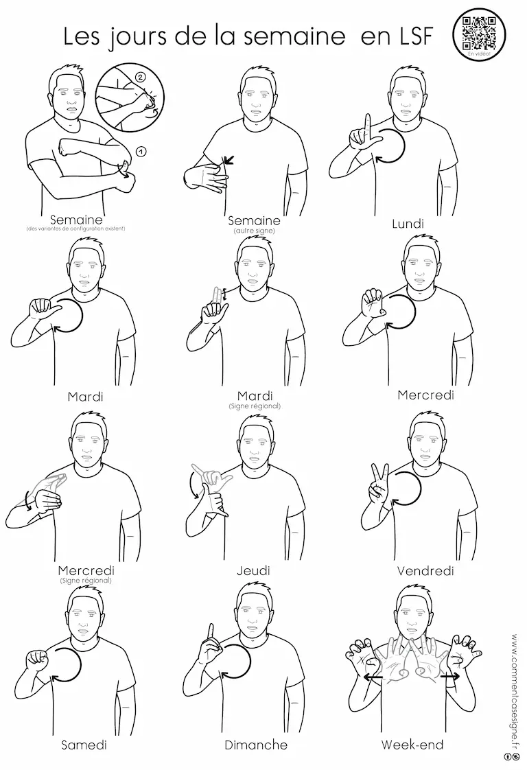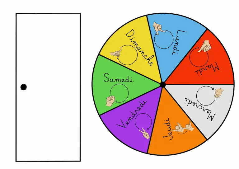 Description : Signaire à imprimer sur le thème des jours de la semaine en LSF (Langue des Signes Française). Il permet d’aborder le vocabulaire du temps (jours, moments de la journée, repères temporels) de manière visuelle et accessible.