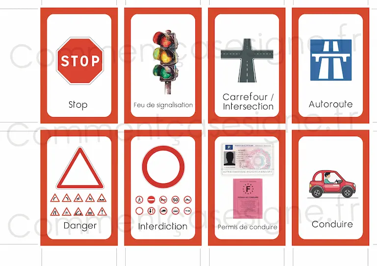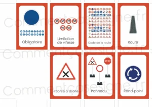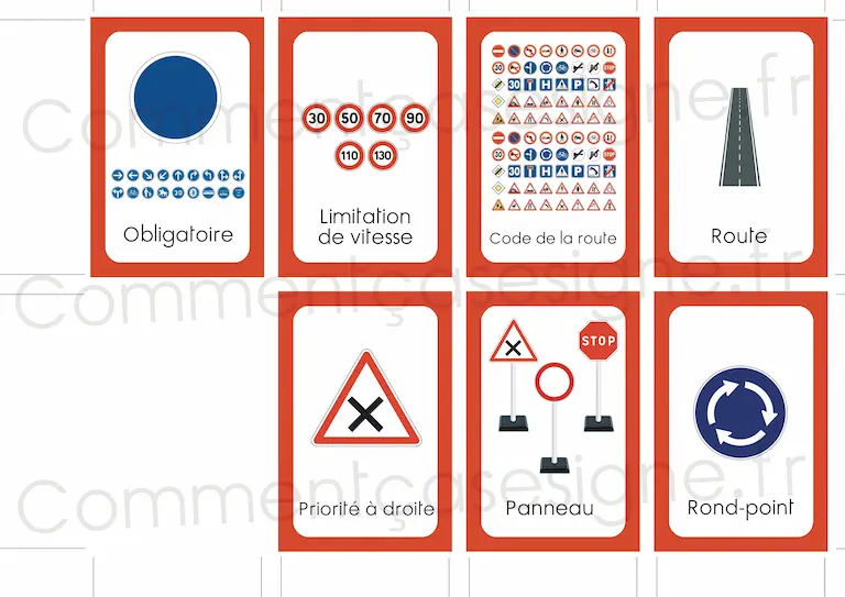 Liste des signes : code de la route, permis de conduire, panneau, autoroute, carrefour, feu de signalisation, stop, rond-point, interdiction, obligation, danger, priorité à droite, limitation de vitesse.
