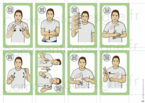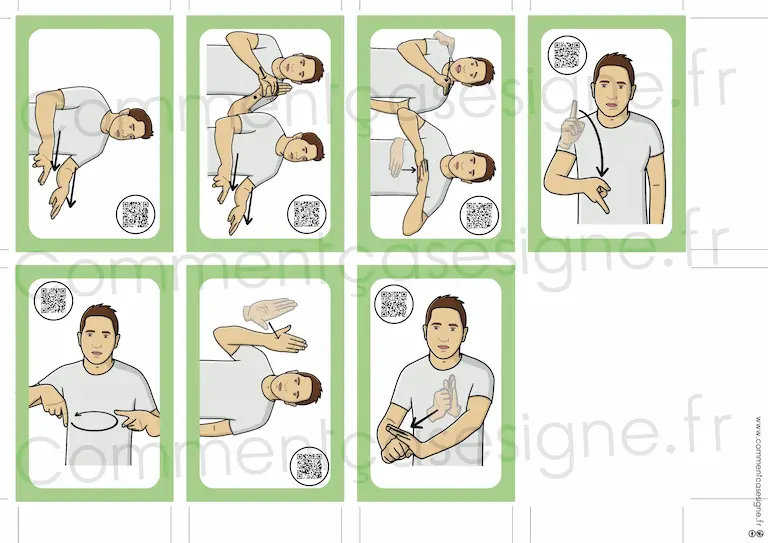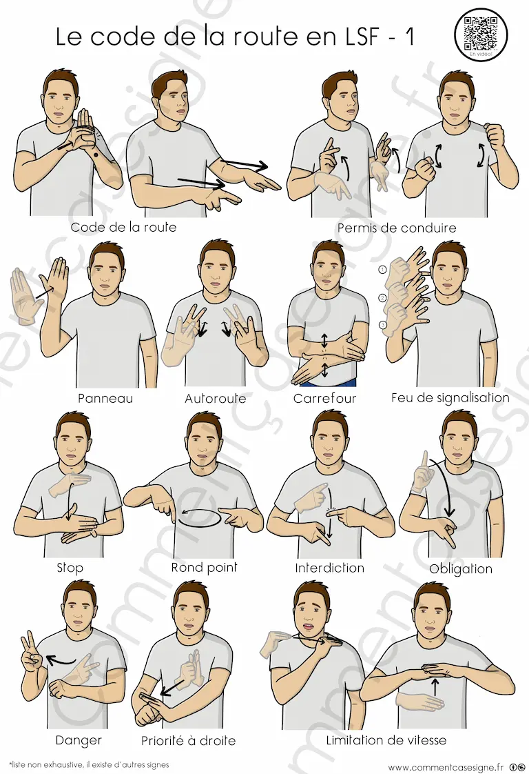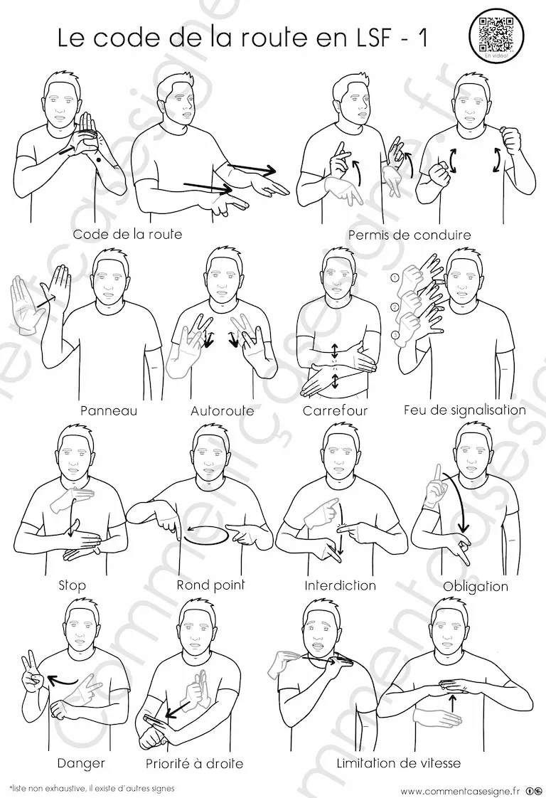 Le signaire est disponible en version couleur et en noir et blanc, et chaque illustration est accompagnée d’un QR code donnant accès à la vidéo du signe.