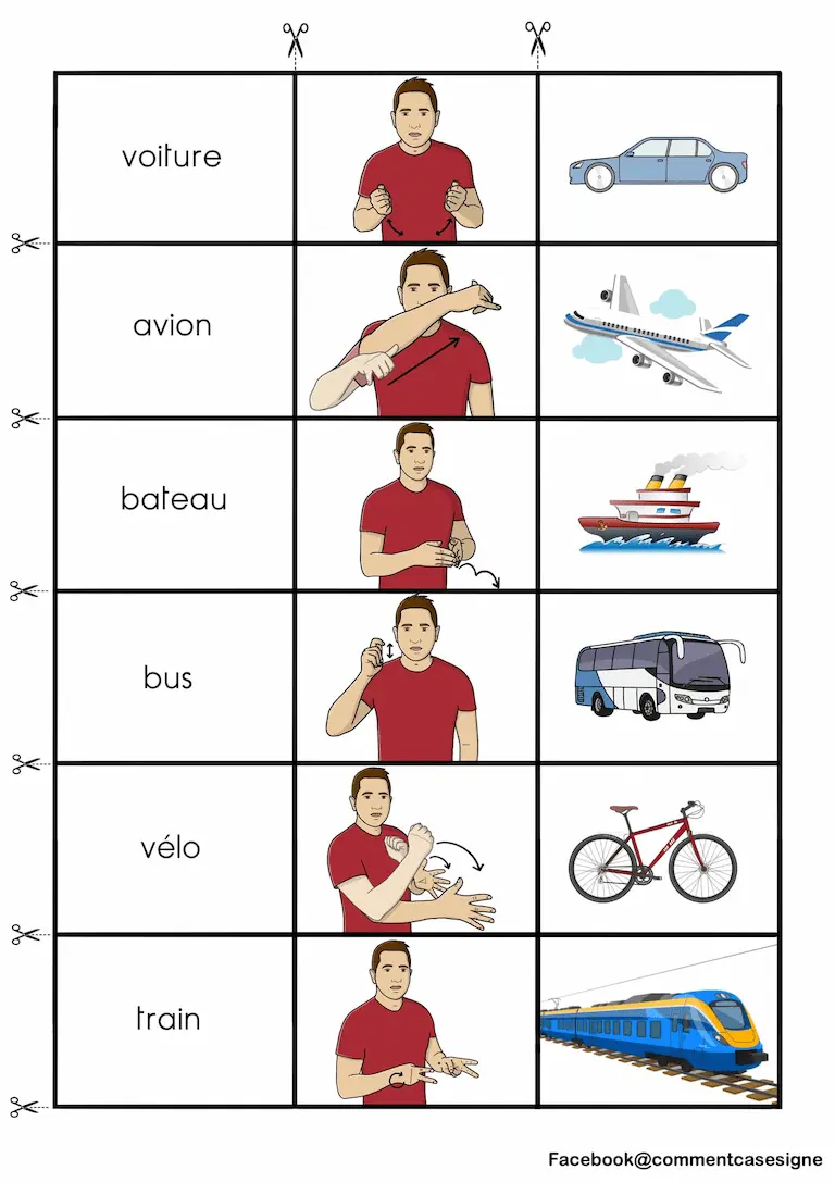 Vous trouverez ici un ensemble de ressources en Langue des Signes Française sur les transports. Cette page rassemble des signaires thématiques, des jeux de cartes, des mémoris, des dominos, ainsi que des vidéos pour apprendre et pratiquer les signes liés aux transports. Bonne exploration !