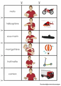 Description : Support pédagogique sur le thème des transports en LSF (Langue des Signes Française). Il comprend des étiquettes à associer combinant l’image, l’illustration du signe en LSF et le mot écrit en français.
