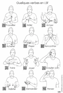 Description : Signaire à imprimer sur le thème des verbes en LSF (Langue des Signes Française). Il regroupe 23 illustrations accompagnées de QR codes permettant d’accéder à la vidéo de chaque signe.