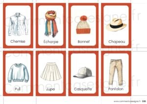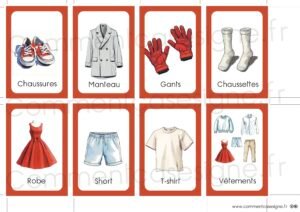Liste des signes : T-shirt, chaussettes, chemise, chapeau, chaussure, manteau, pull, écharpe, robe, jupe, pantalon, gants, pull à col roulé, bottes.